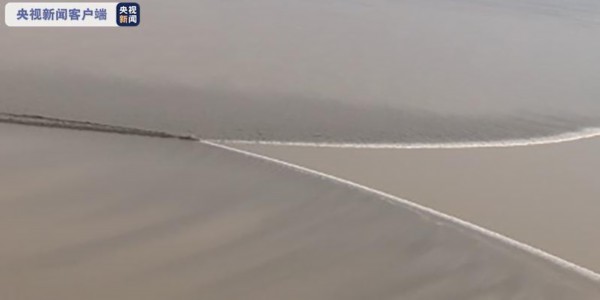 北岸海宁盐官潮形呈现一条直线(左侧为上游)
