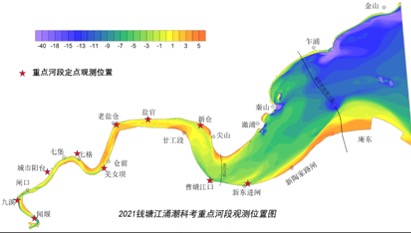 此次监测数据显示,与2010年相比,钱塘江涌潮起潮点十年来向东移动了约5千米;涌潮消亡点在闻堰以西约10千米,位于富春江五丰岛与东洲岛之间。改变了对钱塘江涌潮消亡点在闻堰附近的传统认识。
