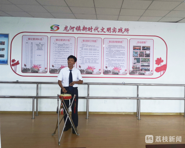 10名退休干部、老乡贤组成“党史宣讲团”,以“党员+乡贤”、“理论+文艺”的形式开展了学党史、唱红歌活动。65岁老乡贤邱绍军用苏北大鼓形式在说唱中让党员群众学习党史。“请让一下,请让一下!同志,我报名,你叫什么名字?我叫陈若克....”龙河镇乡贤会长沈庆伟正在给60余名党员群众带来一场精彩生动的现代历史剧《血奶》,讲述了朱瑞将军的妻子陈若克的感人事迹,引导广大党员干部在历史故事中汲取革命先烈的伟大革命精神。