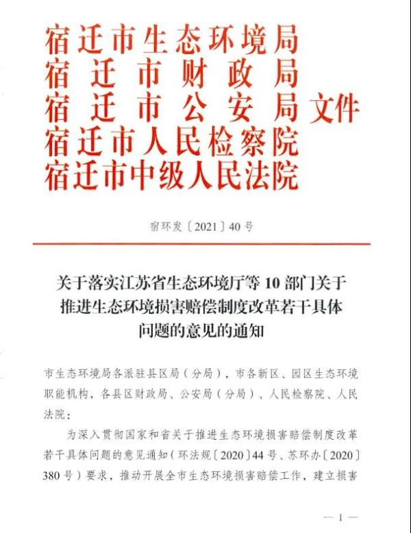 我苏网讯 记者今天获悉,宿迁市生态环境局、宿迁市财政局、宿迁市公安局、宿迁市人民检察院、宿迁市中级人民法院联合日前印发《关于落实江苏省生态环境厅等10部门关于推进生态环境损害赔偿制度改革若干具体问题的意见的通知》(以下简称《通知》),推动开展生态环境损害赔偿工作,建立损害担责、途径通畅、技术规范、修复有效、等价赔偿的生态环境损害赔偿机制。