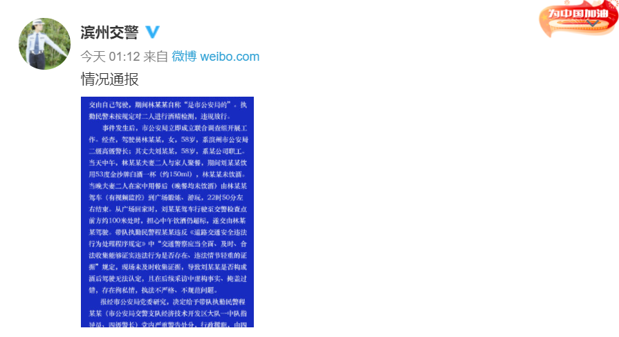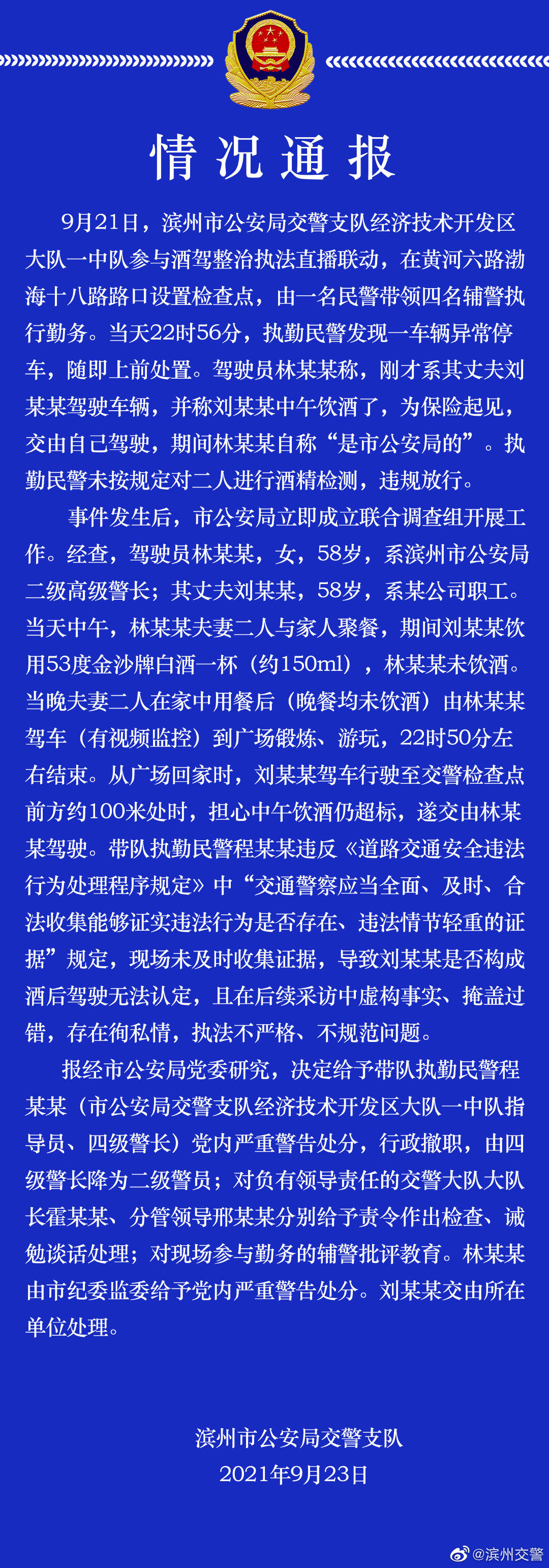 9月21日,滨州市公安局交警支队经济技术开发区大队一中队参与酒驾整治执法直播联动,在黄河六路渤海十八路路口设置检查点,由一名民警带领四名辅警执行勤务。当天22时56分,执勤民警发现一车辆异常停车,随即上前处置。驾驶员林某某称,刚才系其丈夫刘某某驾驶车辆,并称刘某某中午饮酒了,为保险起见,交由自己驾驶,期间林某某自称“是市公安局的”。执勤民警未按规定对二人进行酒精检测,违规放行。
