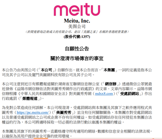 公告称,本公司注意到近日有媒体报道关于湖南省互联网信息办公室透过微信公众号最近发布《益阳市网信办依法对美图秀秀网作出行政处罚》的文章。文章内容显示,益阳市网信办根据《中华人民共和国网络安全法》对美图秀秀网(mdxx8.com)作出行政处罚。