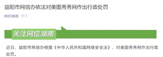 据“网信湖南”日前通报,近日,益阳市网信办根据《中华人民共和国网络安全法》,对美图秀秀网作出行政处罚。