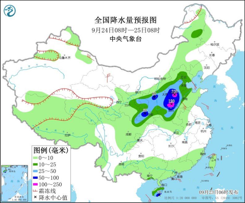 明天,内蒙古东北部、西北地区东部、华北大部、黄淮中部和西部、海南岛等地部分地区有中到大雨,其中,陕西中北部、山西东南部、河北南部、山东西部、河南中北部等地部分地区有暴雨或大暴雨(100~120毫米)。