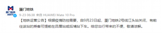 荔枝新闻讯 据“厦门地铁”消息,根据疫情防控需要,自9月23日起,厦门地铁2号线江头站关闭,有前往该站的乘客可提前在吕厝站或后埔站下车。(目前共有镇海路站、中山公园站、江头站因疫情不开放)