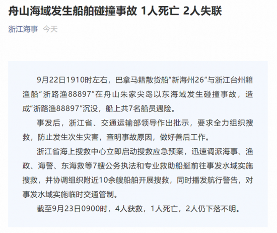 荔枝新闻讯 据“浙江海事”微信公众号消息,9月22日,巴拿马籍散货船“新海州26”与浙江台州籍渔船“浙路渔88897”在舟山朱家尖岛以东海域发生碰撞事故,造成“浙路渔88897”沉没,船上共7名船员遇险。