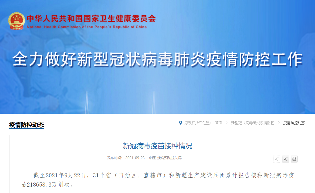 截至2021年9月22日,31个省(自治区、直辖市)和新疆生产建设兵团累计报告接种新冠病毒疫苗218658.3万剂次。