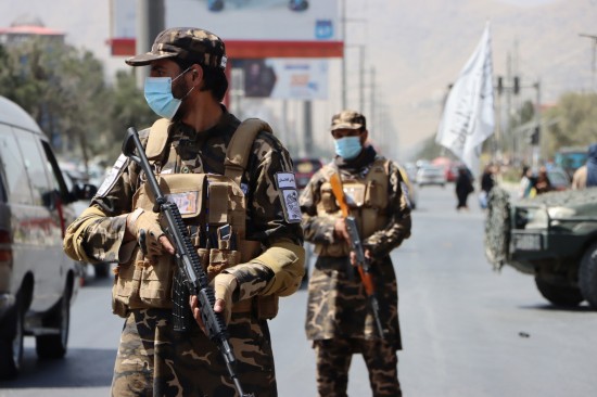 塔利班成员携武器在喀布尔巡逻。