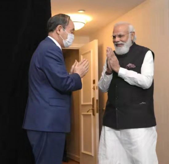 【环球网报道 记者 林泽宇】日本共同社24日消息,日本首相菅义伟与印度总理莫迪美国时间23日在美国华盛顿市内一家酒店中举行了首次面对面会谈,二人在会谈中达成共识,强烈反对在经济层面的施压这种行为和在东海、南海地区“武力单方面改变现状的尝试”。共同社声称,上述共识内容暗指中国,会谈旨在于牵制中国。