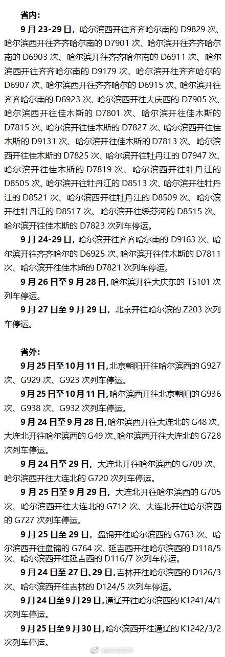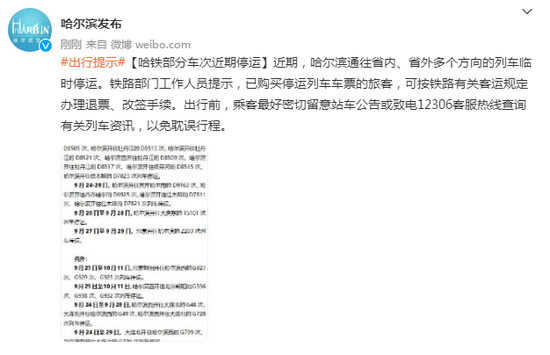 荔枝新闻讯 近期,哈尔滨通往省内、省外多个方向的列车临时停运。铁路部门工作人员提示,已购买停运列车车票的旅客,可按铁路有关客运规定办理退票、改签手续。出行前,乘客最好密切留意站车公告或致电12306客服热线查询有关列车资讯,以免耽误行程。