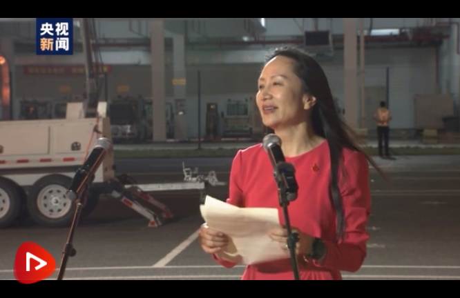 9月25日晚,孟晚舟乘坐包机抵达深圳宝安国际机场,前来现场迎接她的各界人士挥舞着鲜艳的五星红旗,大家齐呼欢迎回家,工作人员向她献上一束玫瑰花。
