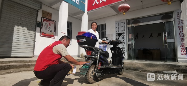 在电动车牌照办理现场,各村居网格员、志愿者还向居民宣传交通安全知识,引导他们骑行时须佩戴头盔,提高安全文明驾驶的意识。