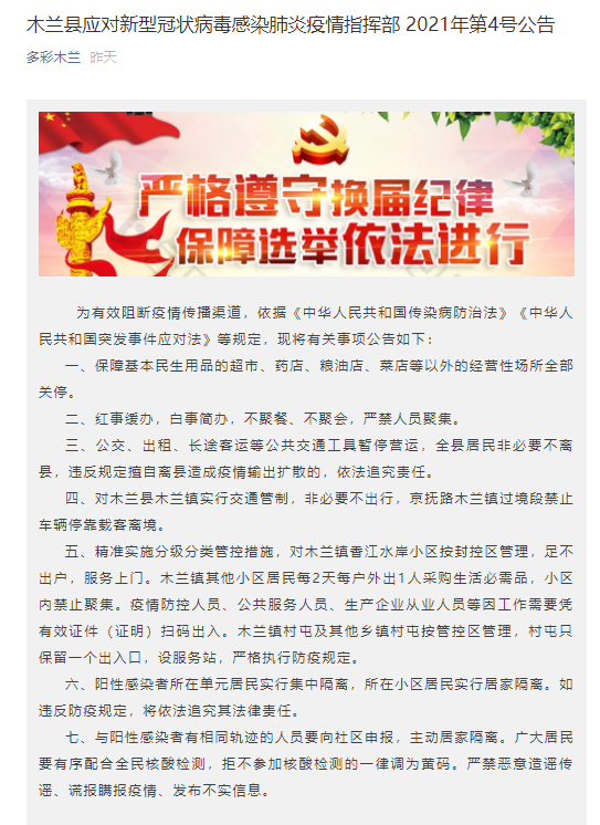 四、对木兰县木兰镇实行交通管制,非必要不出行,京抚路木兰镇过境段禁止车辆停靠载客离境。