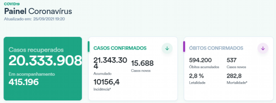 截至当地时间9月25日19时20分,根据巴西卫生部发布的数据,巴西新增新冠肺炎确诊病例15688例,累计确诊21343304例;新增死亡病例537例,累计死亡594200例;累计治愈20333908例。