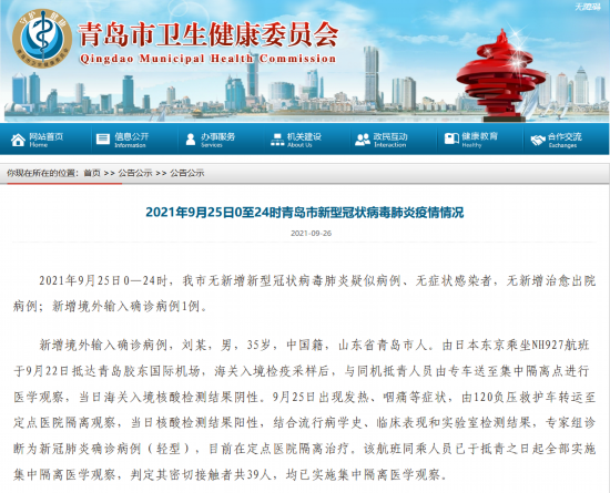 新增境外输入确诊病例,刘某,男,35岁,中国籍,山东省青岛市人。由日本东京乘坐NH927航班于9月22日抵达青岛胶东国际机场,海关入境检疫采样后,与同机抵青人员由专车送至集中隔离点进行医学观察,当日海关入境核酸检测结果阴性。9月25日出现发热、咽痛等症状,由120负压救护车转运至定点医院隔离观察,当日核酸检测结果阳性,结合流行病学史、临床表现和实验室检测结果,专家组诊断为新冠肺炎确诊病例(轻型),目前在定点医院隔离治疗。该航班同乘人员已于抵青之日起全部实施集中隔离医学观察,判定其密切接触者共39人,均已实施集中隔离医学观察。