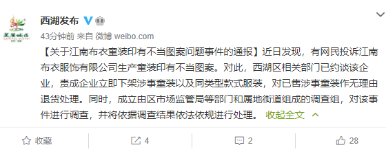 据“西湖发布”官微消息,杭州市西湖区人民政府新闻办公室在其官微发布了关于江南布衣童装印有不当图案问题事件的通报,全文如下:
