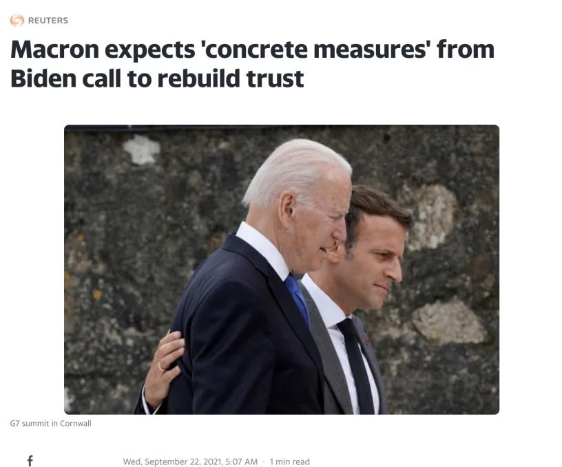 这场法国媒体宣称的“世纪之骗”曝光于世后,西方后院接连起火。在美法僵局持续近一周后,22日,拜登主动给马克龙通话。