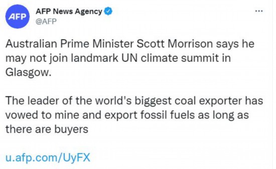 据法新社报道,面临2050年净零碳排目标压力,澳大利亚总理莫里森在27日刊出的专访中表示,他可能不会出席11月在苏格兰格拉斯哥举行的联合国气候峰会。