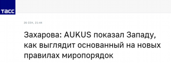 扎哈罗娃当天在“俄罗斯1台”一档叫做《周日晚与弗拉基米尔·索洛维约夫有约》的节目中表达了自己的观点。“西方集体用新规则冒充法律,不断向议程中加入这些规则,”扎哈罗娃说,“所有人都一再说,新的世界秩序将基于这些新规则。所有人都很喜欢(这种观念)。但当实际中遇到这一观念时,就有人不再喜欢。当美国、英国和澳大利亚在不向任何人征求意见的情况下,有一天想出了一个新的三边联盟,这一联盟改变了世界格局、集体安全与国际稳定形势。不知为何,这些不久前还很有趣的新规则却显得不那么诱人。”