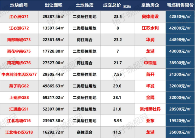 在买房人关心的房价方面,本次土拍中多个板块的毛坯限价有所上涨,其中江北板块颇为“亮眼”。来自江北的宅地包括桥林、江浦、江北核心区等片区,其中G19地块的毛坯限价达到38000元/㎡,相比此前当地35000元/㎡的毛坯房限价,G19地块的涨幅达到3000元/㎡,未来房价将破“4”。在纯刚需桥林板块,G99-G102地块的毛坯房限价均为24500元/㎡,相比之前20000元/㎡的毛坯房限价突破较大,达到4500元/㎡,是所有地块中涨幅最多的。此外,这批地块里南部新城的2幅宅地毛坯限价最高,G73地块毛坯房限价为44898元/㎡,G74地块则达到44998元/㎡,未来房价预计破“5”;热门板块河西的2幅宅地均来自江心洲,未来毛坯房限价分别为42800元/㎡和42850元/㎡,较之以往40780元/㎡的毛坯房限价,涨幅在2000元/㎡左右。