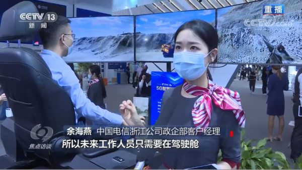 中国电信浙江公司政企部客户经理 余海燕:通过5G的低时延、高带宽可以实现秒级的响应,所以未来工作人员只需要在驾驶舱就可以操作矿山这些危险的作业。