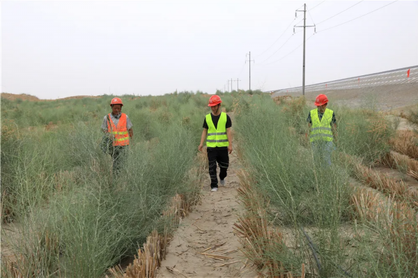 和若铁路地处有着“死亡之海”之称的世界第二大流动性沙漠塔克拉玛干沙漠南缘,和若铁路有一半受到风沙的影响。为防止沙害对施工的影响,该条铁路在建设初期就提出“治沙先行”的建设理念,风沙防护工程与铁路建设同步进行,这在全国铁路建设中也尚属首次。目前,铁路沿线的一道道绿色长廊已成为防风治沙的天然屏障。建设者在沿线共修建草方格近5000万平方米,种植梭梭树、红柳、沙棘等灌木和乔木近1300万株。