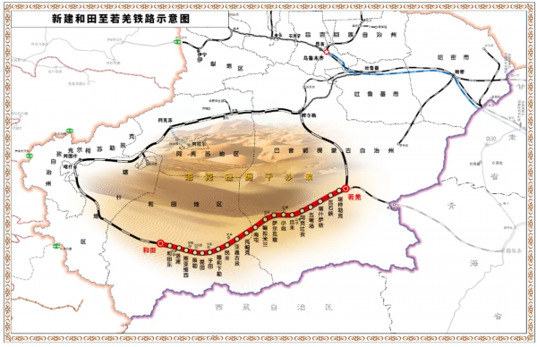 和若铁路全长825.476公里,是国家重点铁路工程,连接新疆维吾尔自治区南部的和田地区与巴音郭楞蒙古自治州若羌县。和若铁路设计时速120公里,共设20个站点,其中9个客运车站,于2018年底正式开工建设,2020年5月开始全面铺轨,预计2022年6月开通运营。