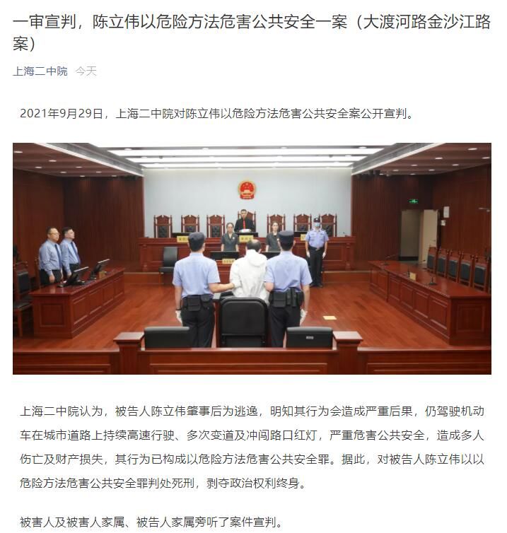 荔枝新闻讯 2021年9月29日,上海二中院对陈立伟以危险方法危害公共安全案公开宣判。