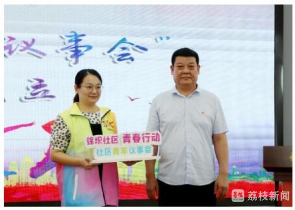▲徐坝社区党总支书记周晓良为社区青年议事会授牌