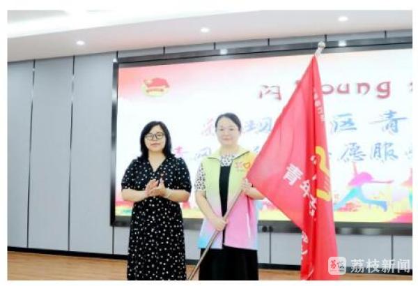 ▲街道宣传委员黄霞为“青风徐徐”青年志愿服务团队授旗。