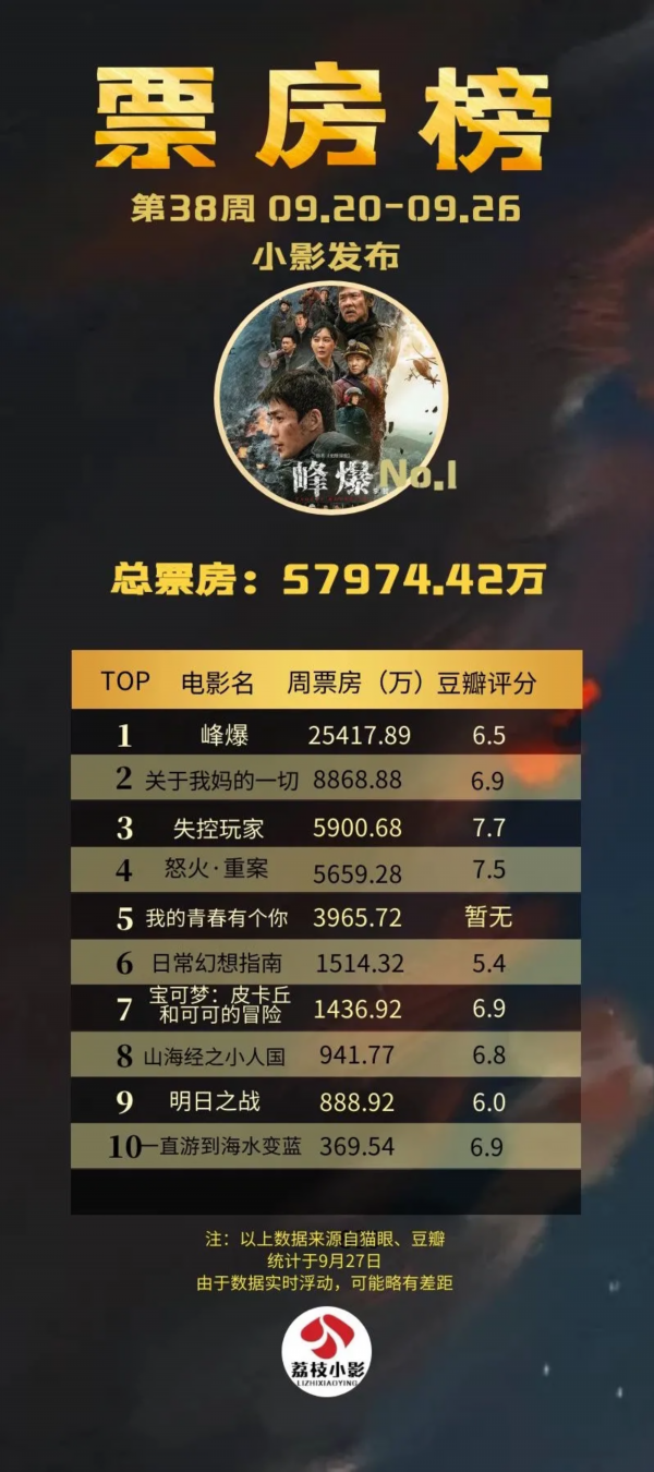 《峰爆》势如破竹,高位引领大盘。《怒火·重案》正式超过《拆弹专家2》,成为中国影史港片票房冠军,《失控玩家》以6.12亿的成绩结束内地票房征程,而小众纪录片《一直游到海水变蓝》挤进了前十名席位,尽管票房不到300万,但对于市场多元化的推动有很强的积极作用。