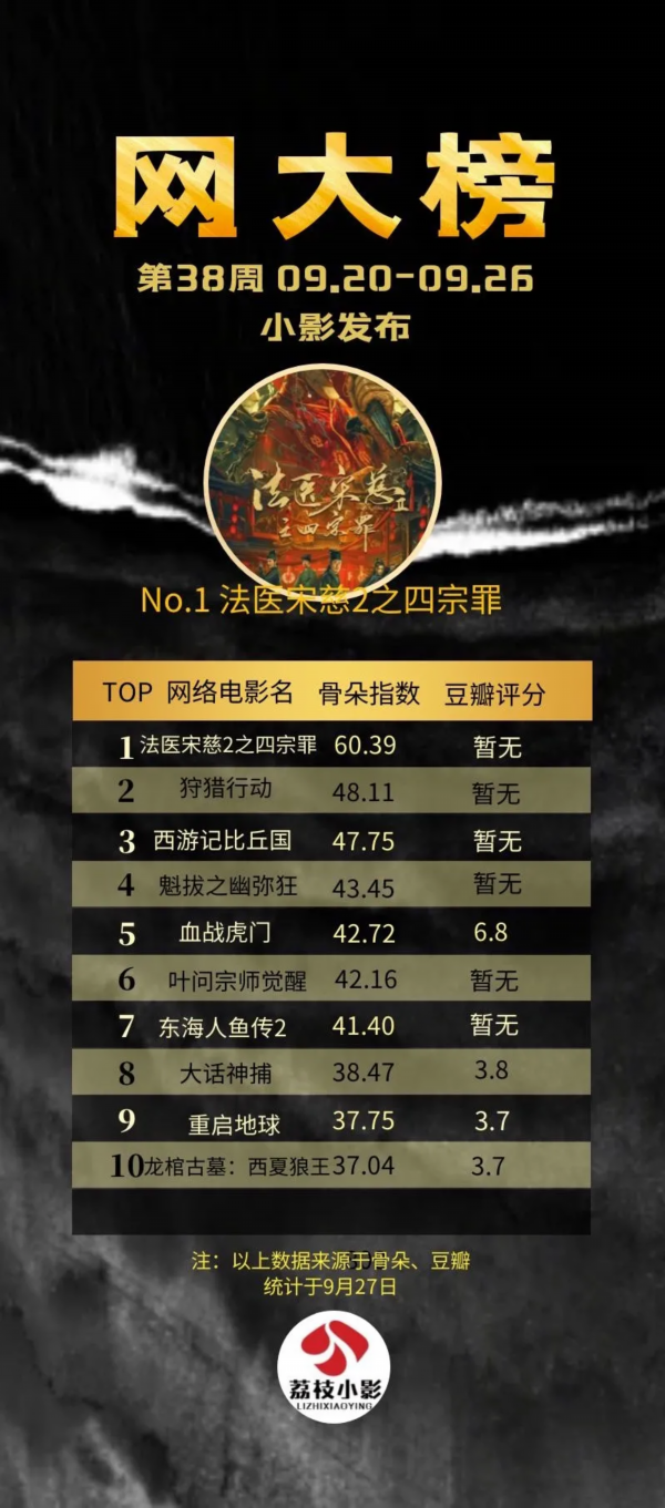 本周网大榜变化较大,有5部新片杀入前十,分别是来自爱奇艺平台的《法医宋慈2之四宗罪》《狩猎行动》,以及腾讯视频的《西游记比丘国》《魁拔之幽弥狂》《东海人鱼转2》。
