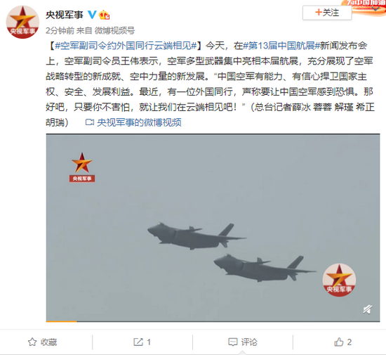 今天,在第13届中国航展新闻发布会上,空军副司令员王伟表示,空军多型武器集中亮相本届航展,充分展现了空军战略转型的新成就、空中力量的新发展。“中国空军有能力、有信心捍卫国家主权、安全、发展利益。最近,有一位外国同行,声称要让中国空军感到恐惧。那好吧,只要你不害怕,就让我们在云端相见吧!”