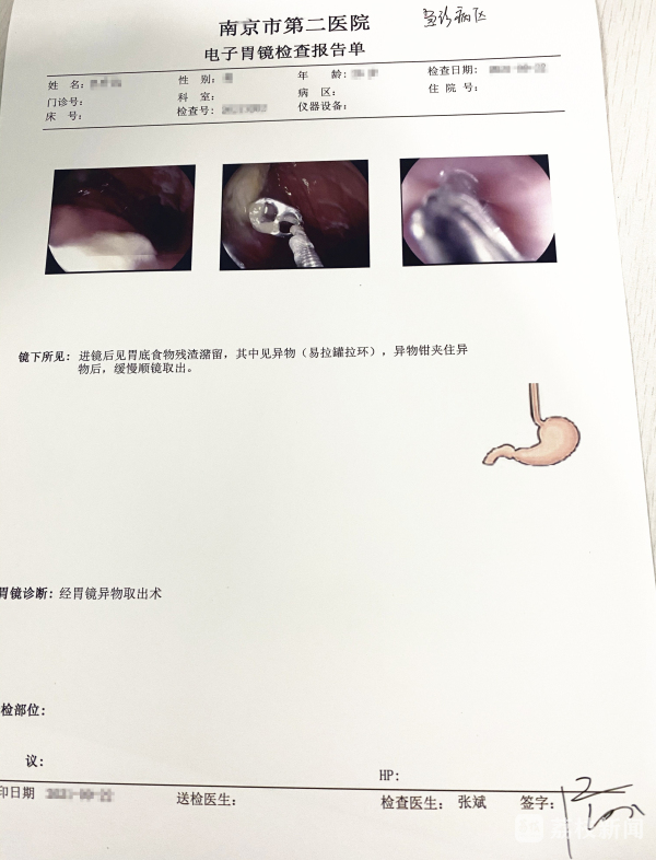 急诊科、胃镜室快速处置,顺利取出胃底的拉环