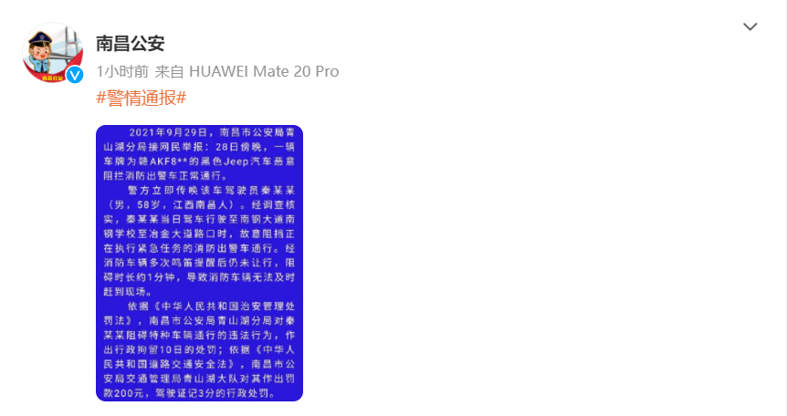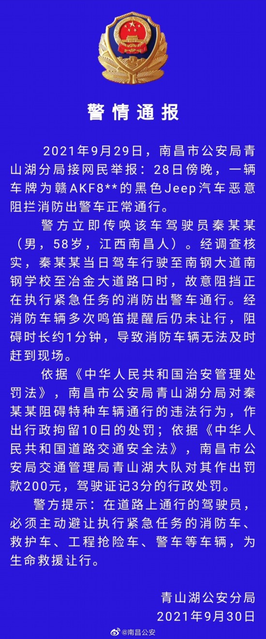 荔枝新闻讯 据江西省南昌市公安局官方微博消息,2021年9月29日,南昌市公安局青山湖分局接网民举报:28日傍晚,一辆车牌为赣AKF8*的黑色Jeep汽车恶意阻拦消防出警车正常通行。