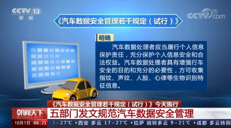 由国家网信办等五部门联合发布的《汽车数据安全管理若干规定(试行)》,今天(10月1日)正式施行。