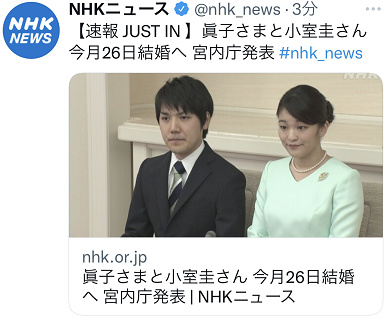 日本广播协会(NHK)刚刚消息,日本宫内厅1日发表消息称,德仁天皇的侄女、皇嗣秋筱宫文仁的长女真子与小室圭将于10月26日结婚。