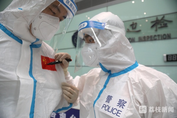 勤务开始前,民警在防护服画上国旗,庆祝祖国生日。