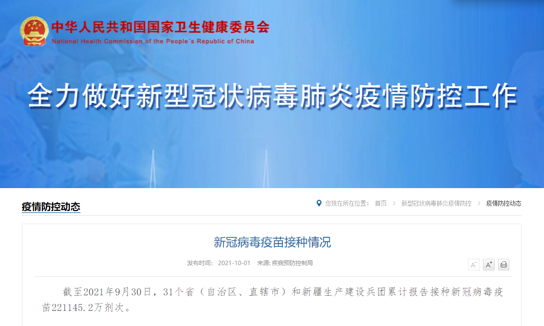 据国家卫健委网站消息,截至2021年9月30日,31个省(自治区、直辖市)和新疆生产建设兵团累计报告接种新冠病毒疫苗221145.2万剂次。