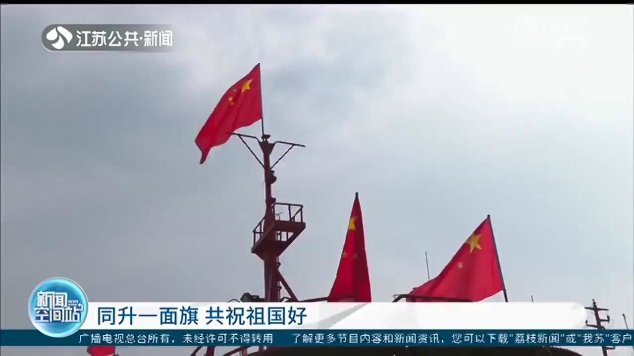 在连云港赣榆等地,渔民们在自家渔船上悬挂起大大小小鲜艳的国旗,表达对祖国的祝福。