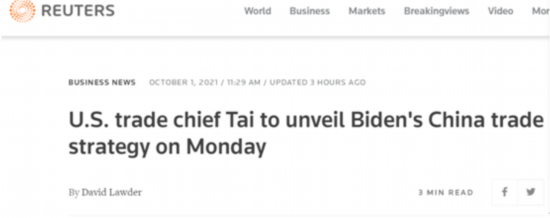 据路透社报道,美国贸易代表办公室当地时间9月30日在一份声明中表示,贸易代表戴琪下周一(10月4日)将在位于华盛顿的智库“战略研究中心”(Center for Strategic Studies)发表演讲,公布拜登政府的美中贸易关系战略。