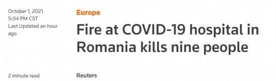路透社援引罗马尼亚官员消息称,该国一新冠定点医院的重症监护室10月1日发生火灾,造成至少9人死亡。报道称,这是该国在不到一年时间里发生的第三次致命的医院火灾。