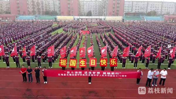在中华人民共和国成立72周年之际,连云港市东海县石榴高级中学的3500名师生开展了以“奋斗强国 追逐梦想 砥砺前行”为主题的快闪活动,为祖国送上生日祝福。活动中,3000多名师生以整齐的队伍排列在操场上,随着队伍的变换,一个巨大的“72”呈现出来,代表着祖国的72岁生日,随后3500多名师生挥舞着手中的国旗,欢呼着口号,伴随着嘹亮的歌声舞动,学生们青春洋溢的面孔、灿烂如花的笑容,彰显出积极向上、朝气蓬勃的风采。