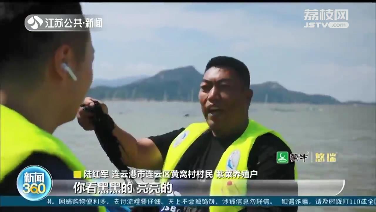 江苏台记者范思成说:“我现在来到的是紫菜养殖区。我背后这里能看到漂在海面上有很多发紫的就是紫菜,紫菜长势很好。”