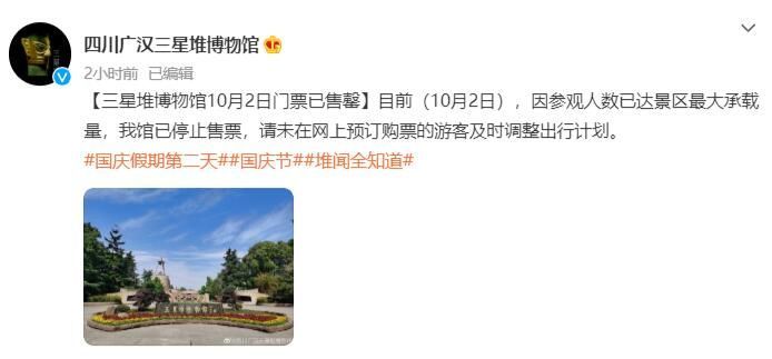 荔枝新闻讯 据四川广汉三星堆博物馆官方微博消息,目前(10月2日),因参观人数已达景区最大承载量,三星堆博物馆已停止售、验票,请未在网上预订购票的游客及时调整出行计划。