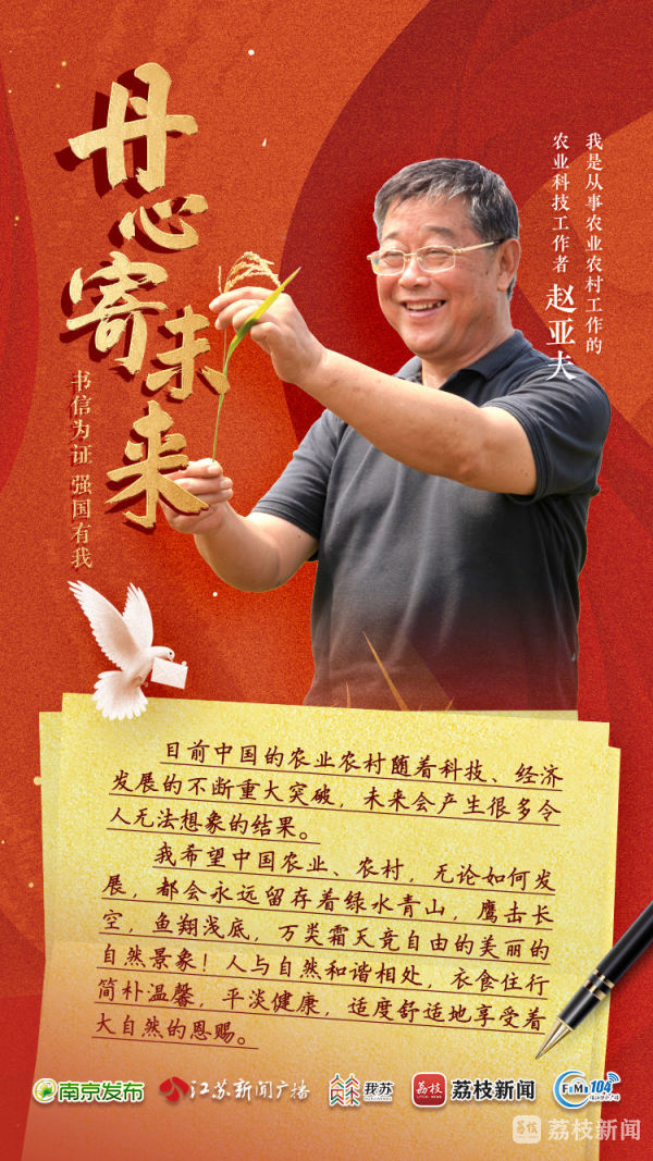 荔枝新闻讯 由江苏省广播电视总台、中共南京市委网信办联合发起的“丹心寄未来——书信为证、强国有我”全国征集活动,眼下正在全国各地火热开展中。在此次活动中,时代楷模、全国脱贫攻坚楷模、农业科技专家赵亚夫落笔为证,用赤诚之心诉说献身三农事业的决心和对乡村振兴的美好愿景。