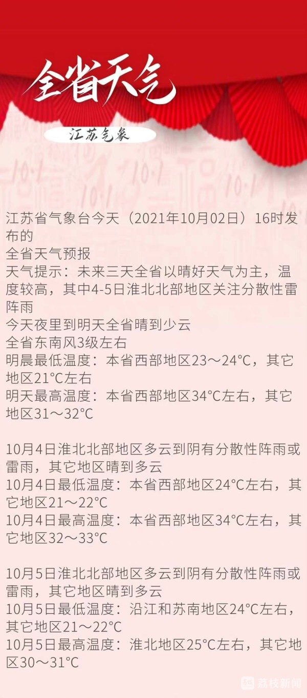 江苏国庆假期的天气很是应景,大部分地区晴好贯穿始终,不过晴好的背景下,晴热又卷土重来了,昨天午后沿江苏南城市最高温度都突破了30度,白天阳光热情四射,但一早一晚气温下降较快,体感微凉。今晨全省晴到多云,大部分城市伴有轻雾。