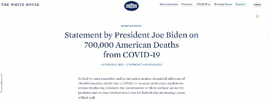 【环球网报道 记者 张江平 侯佳欣】美国新冠死亡病例超过70万例之际,美国总统拜登10月2日发表声明,在缅怀死者的同时,呼吁民众接种疫苗。