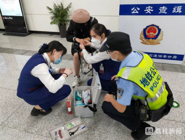 环球港地铁站,因客流密集,一女乘客不慎摔倒,多处擦伤。交通治安分局地铁北站派出所民警立即联系站务等工作人员到现场作消毒、包扎处理。