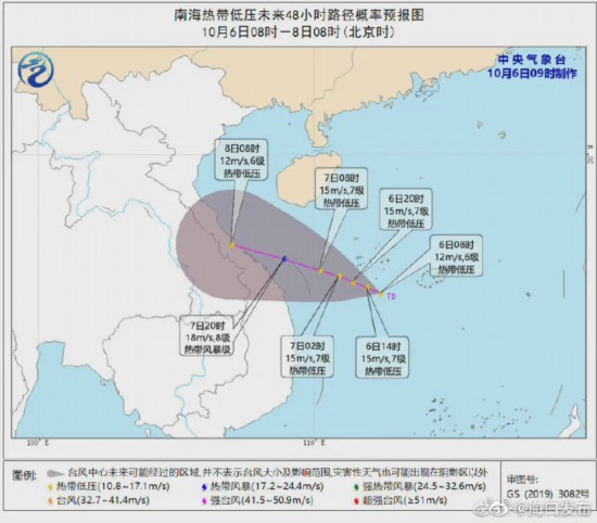 海南省气象局10月6日9时50分发布台风四级预警:原位于南海东南部海面的热带云团于6日8时加强为热带低压,8时距离海南省三沙市约180公里,中心附近最大风力6级(12米/秒),预计该低压中心将以10公里左右的速度向西偏北方向移动,有可能于明天夜间加强为热带风暴级,并于8日早晨在越南中部沿海登陆。